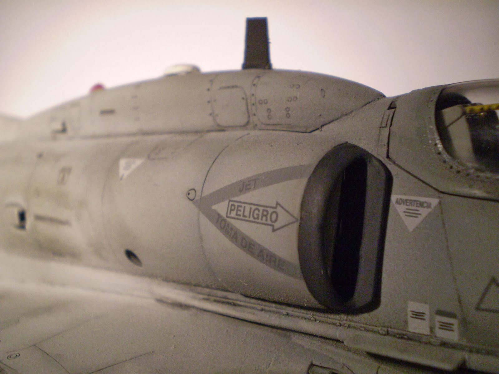 Las banderas de la deriva y las escarapelas sobre los aerofrenos son de un kit de Aerocalcas pertenecientes al A4-B, al igual que las balizas de CUIDADO de la cabina, y las señales NO PISAR de los tanques auxiliares.